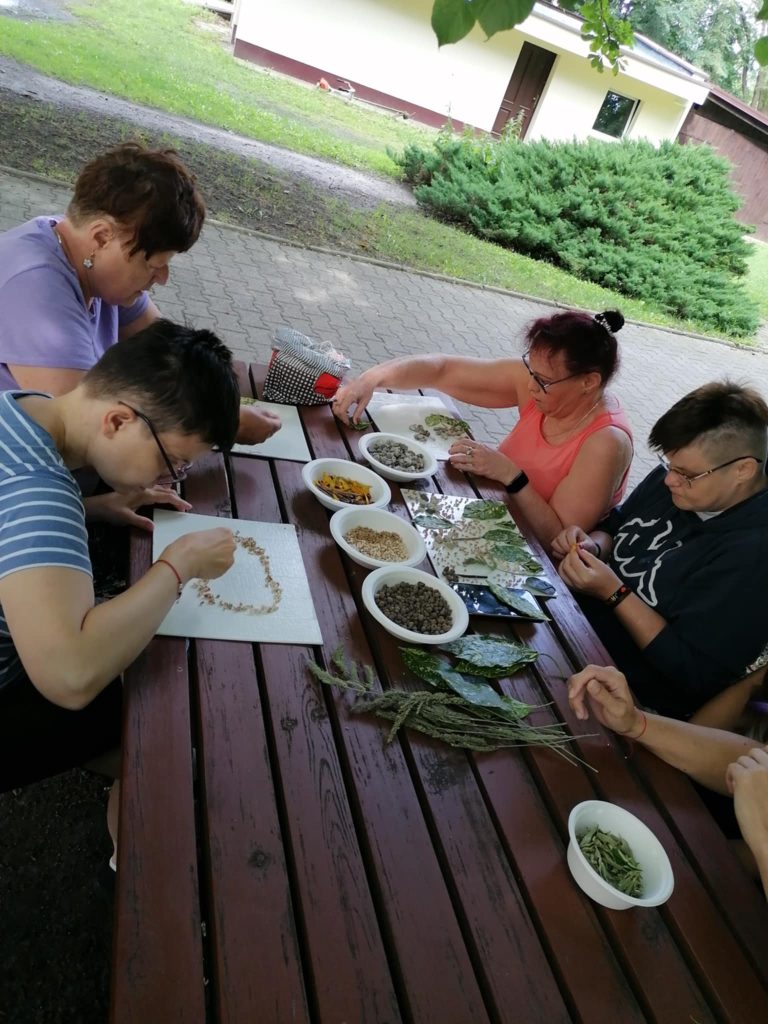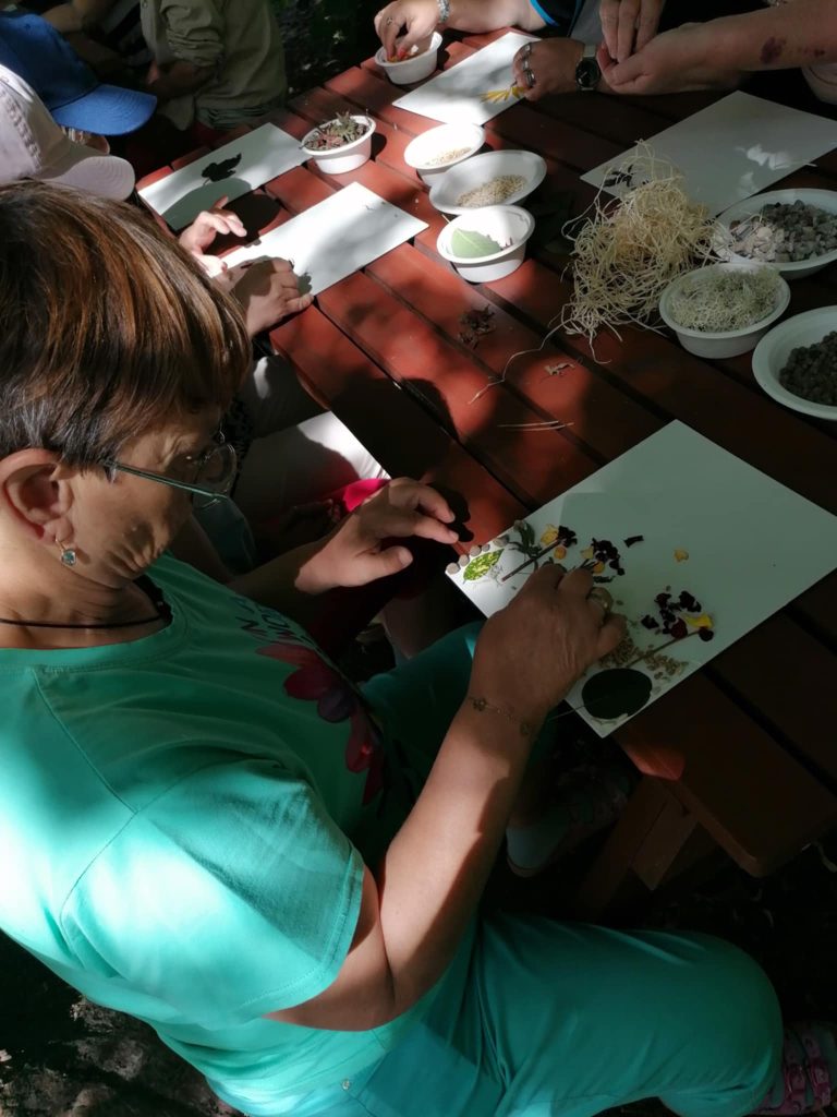 Pierwsze warsztaty poświęcone były tworzeniu autoportretów z naturalnych materiałów zebranych wcześniej w ogrodzie. Uczestnicy wykorzystywali liście, kwiaty, gałązki i inne elementy przyrody, mocując je na przygotowanych płótnach. Takie działanie pobudzało wyobraźnię, uruchamiało zmysły oraz pozwalało spojrzeć na autoportret w nowy, kreatywny sposób.